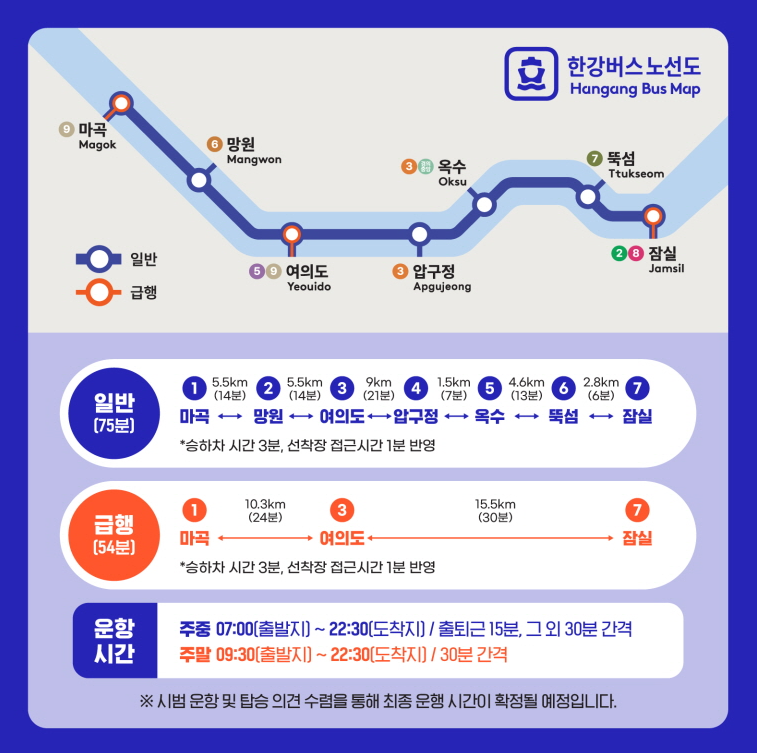 일반(75분): 마곡 → 망원 → 여의도 → 옥수 → 압구정 → 뚝섬 → 잠실