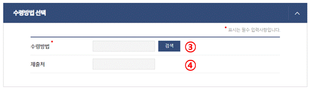 ③ 수령방법 검색버튼을 클릭하여 수령방법을 선택