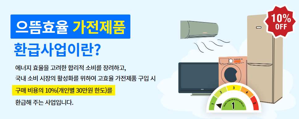 으뜸효율 가전제품 환급사업은 대한민국 국민이 최상위 효율 등급 가전제품을 구매할 경우, 구매비용의 10%(개인별 30만원 한도)를 환급 해드립니다.