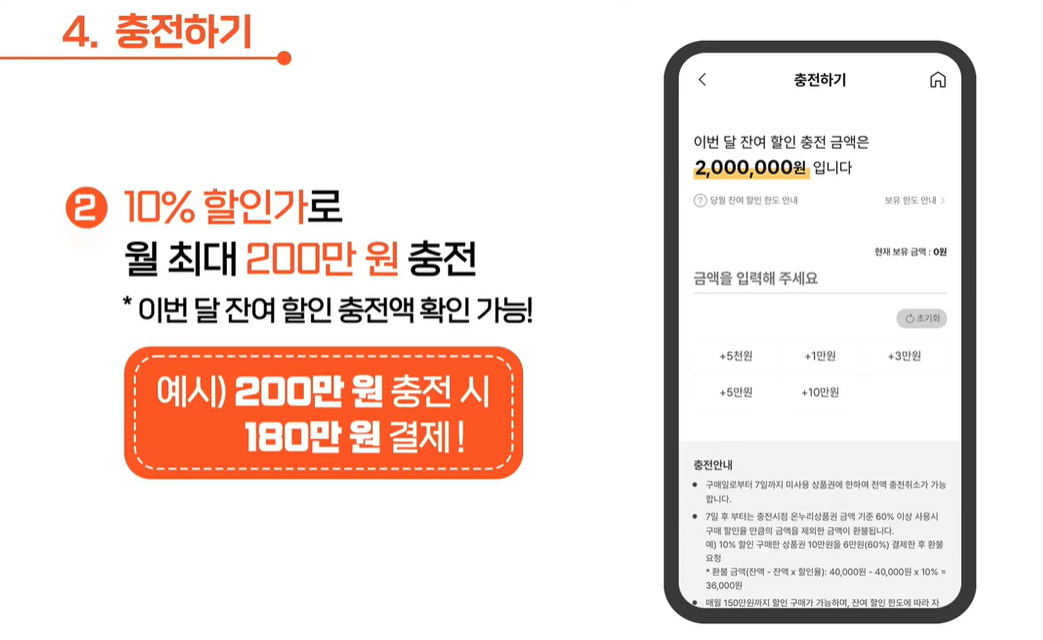 충전하고자 하는 금액 충전 시 10% 할인가로 충전되며, 최대 보유한도 200만원까지 가능합니다.