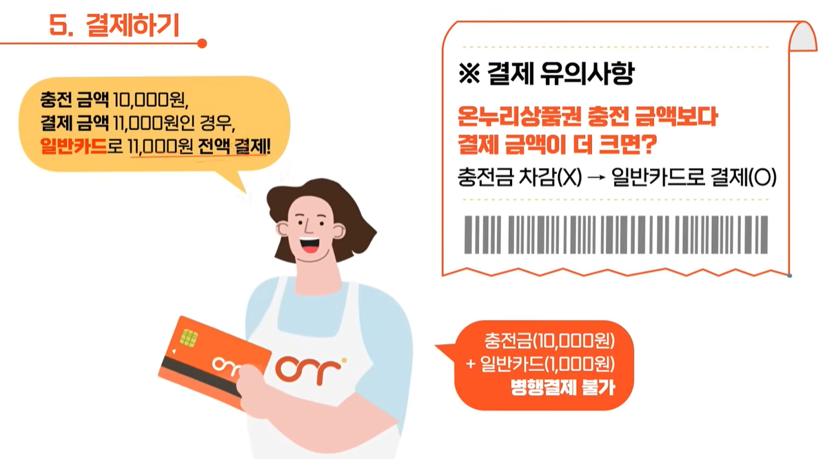 단, 온누리상품권 충전 금액보다 결제 금액이 더 큰 경우, 병행결제가 불가하며 일반카드로 결제됩니다.