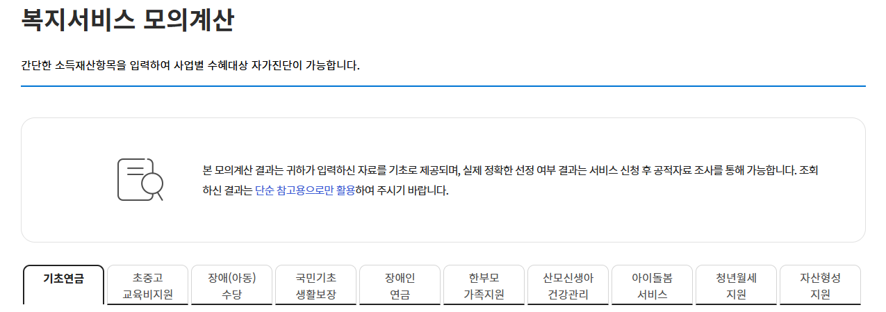 복지로 사이트에서 모의계산을 통해 수혜대상 자가진단이 가능합니다. 참고용으로만 활용해 주시기 바랍니다.