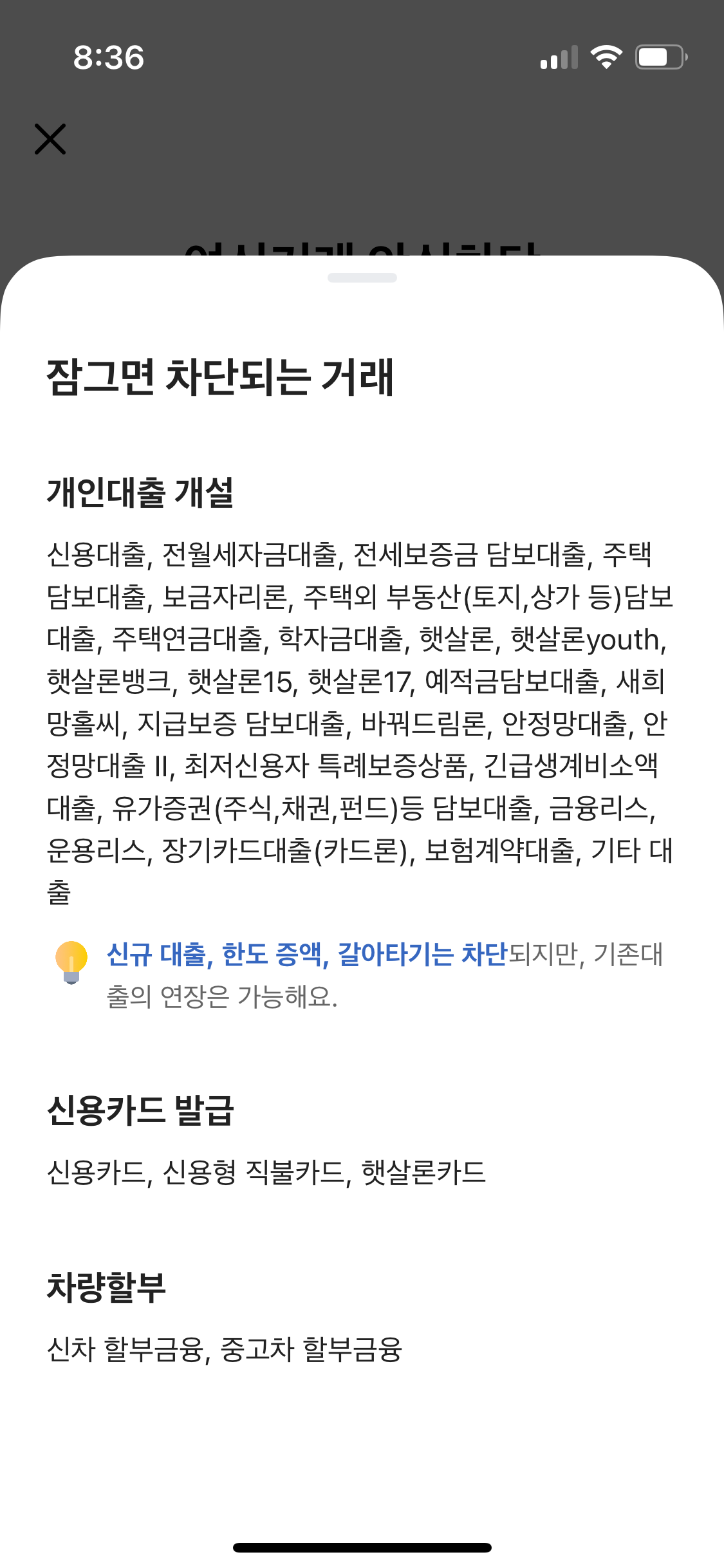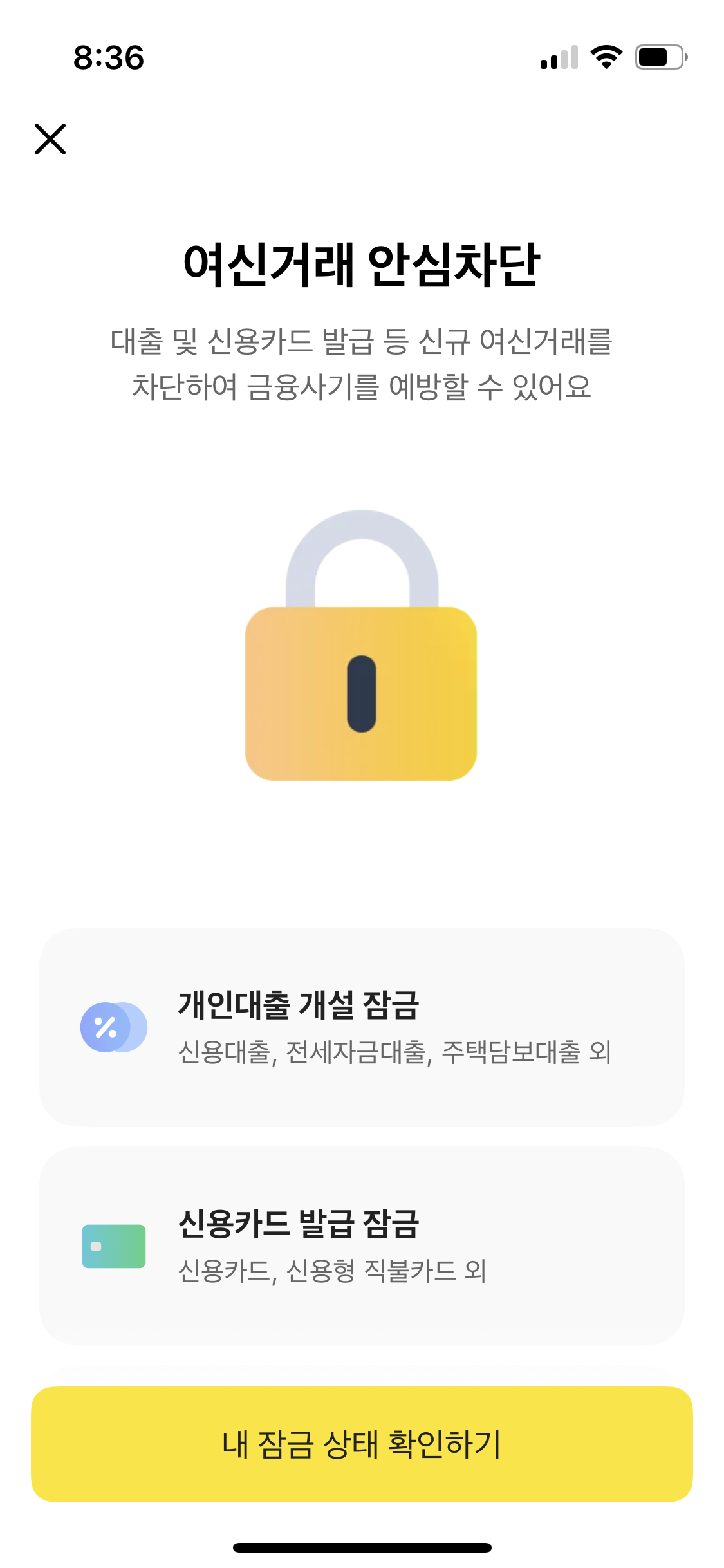 ㆍ예시) 은행 앱 실행 > 인증보안/금융사기 예방 > 여신거래 안심차단 메뉴 선택 > 등록 완료