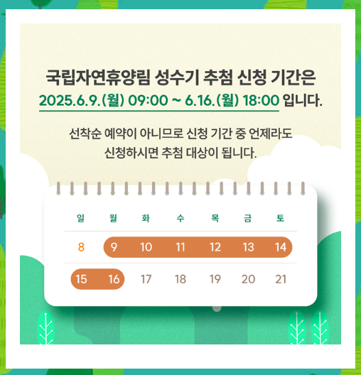 추첨 결과 발표: 2025년 6월 19일(목) 10:00 — 숲나들e 마이페이지 및 알림톡 통해 확인 가능