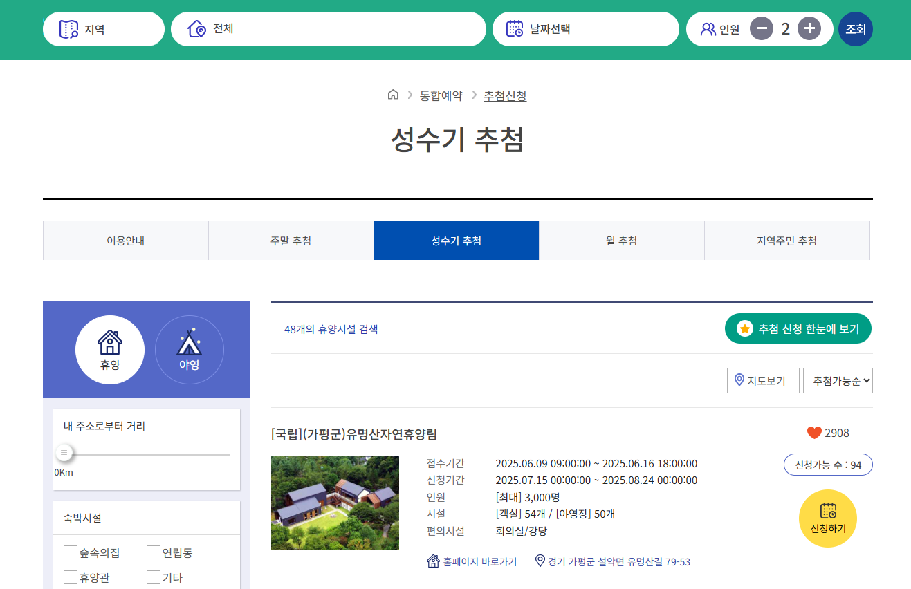 ③통합예약 메뉴 > 추첨신청 > 성수기 추첨