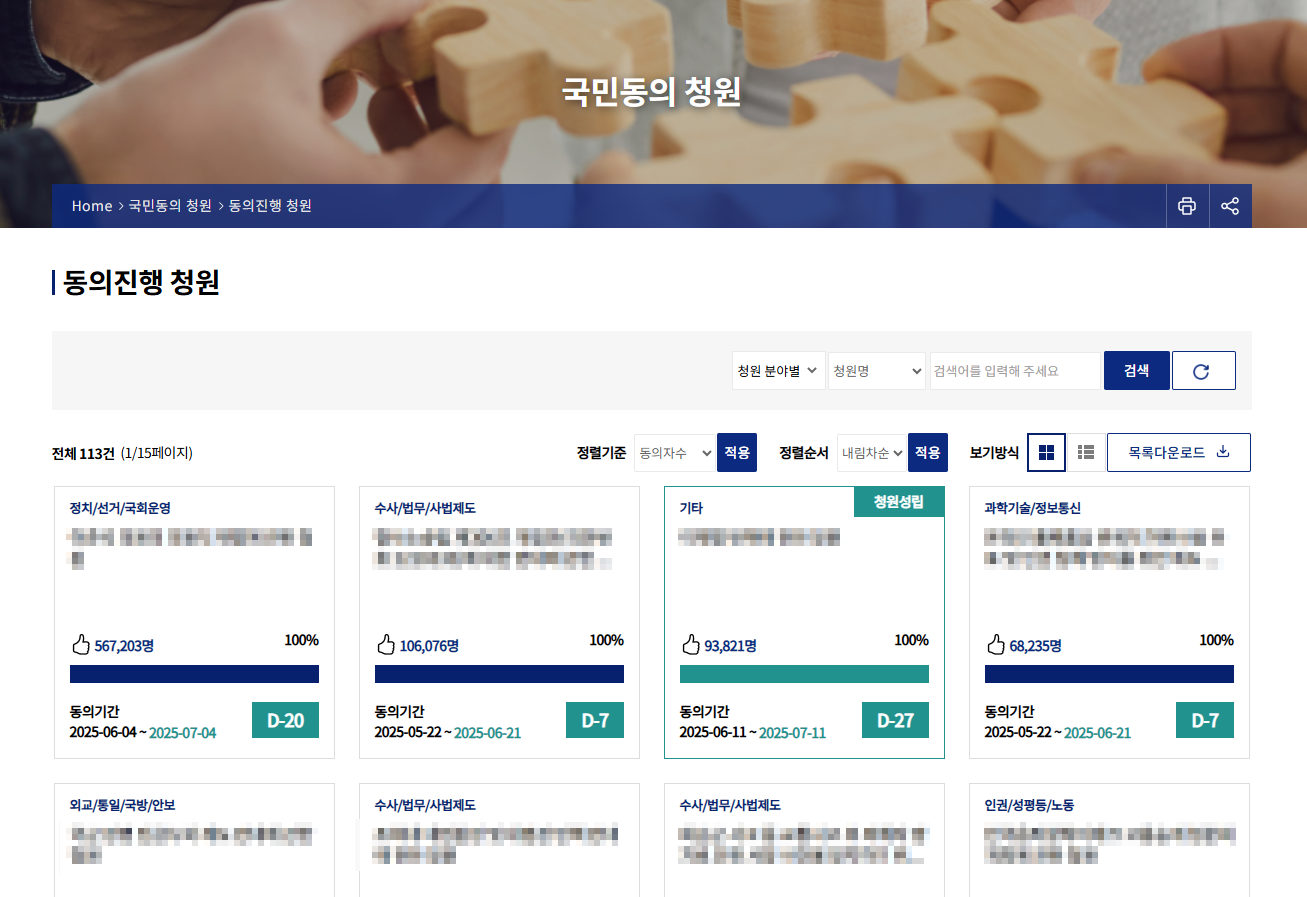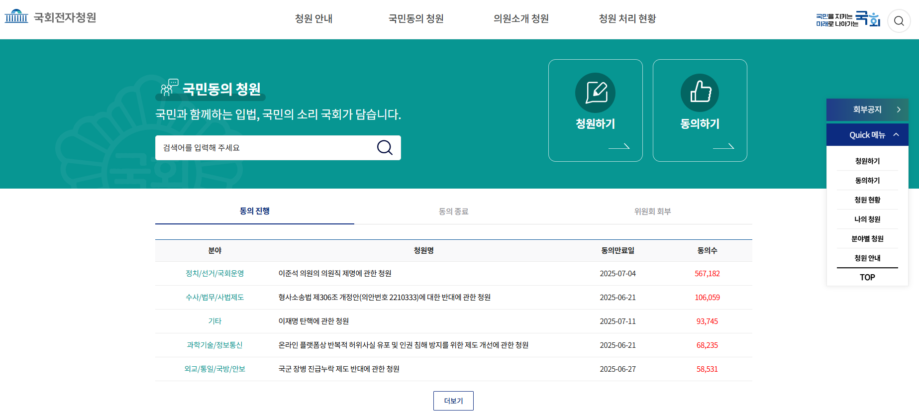 청원이 게시되면 국민의 동의를 받아야 국회 심사로 넘어갑니다.