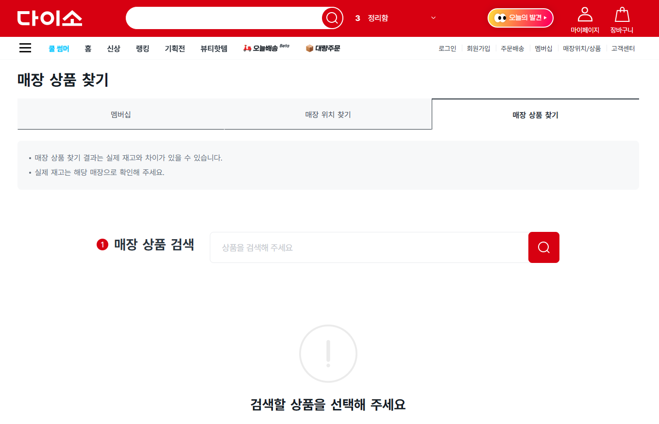 다이소 오프라인 매장을 가시기 전, 찾으시는 물품이 매장에 있는지 미리 확인하실 수 있습니다.
