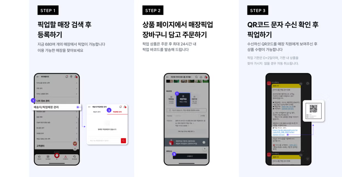 다이소몰에서 상품 주문 후 가까운 다이소 매장에서 픽업하세요! 이제 픽업 매장이 전국 680여 개로 더 확대되어 필요한 순간에 편리하게 매장픽업 서비스를 이용하실 수 있습니다.