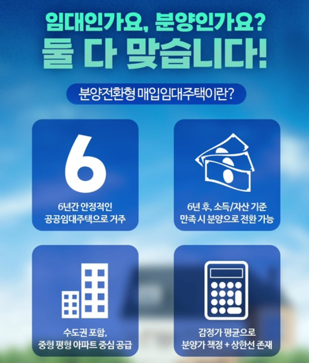 분양전환형 매입임대주택은 말 그대로 6년 동안은 임대주택으로 거주하고, 이후 일정 기준을 충족하면 분양 전환이 가능한 주택입니다.