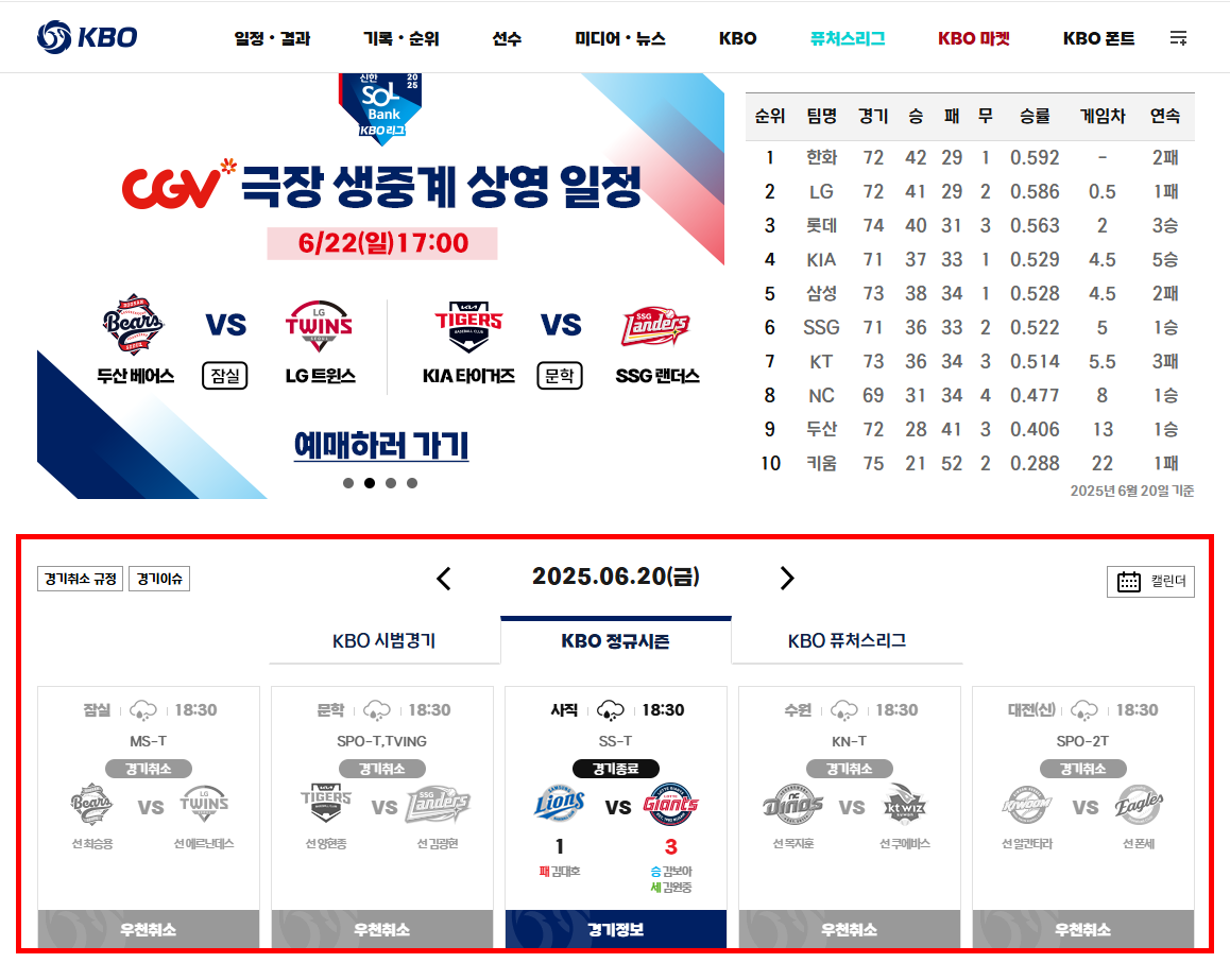 경기 전 우천으로 인한 경기 진행여부가 궁금하시다면, KBO 홈페이지에서 확인 가능합니다.